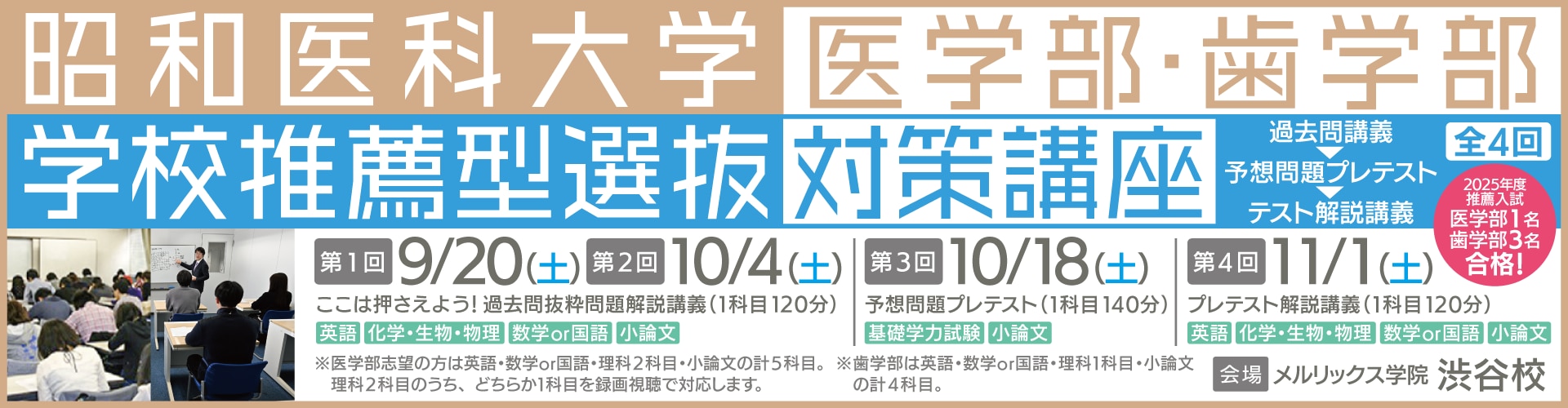 メルリックス学院では昭和大学歯学部の推薦対策講座を毎年実施しています。今年も9/20(土)よりスタートします。