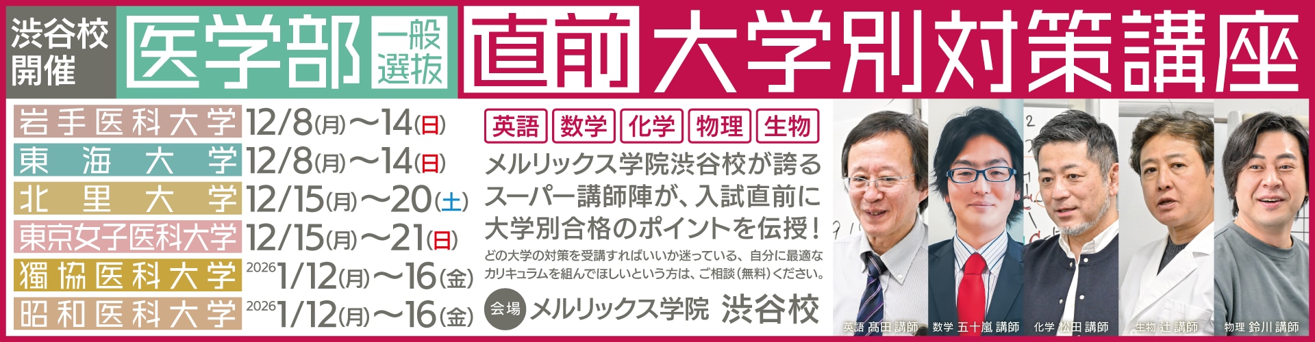 辻講師と松田講師が担当するメルリックス学院 渋谷校の【医学部直前大学別対策講座】はこちらから!