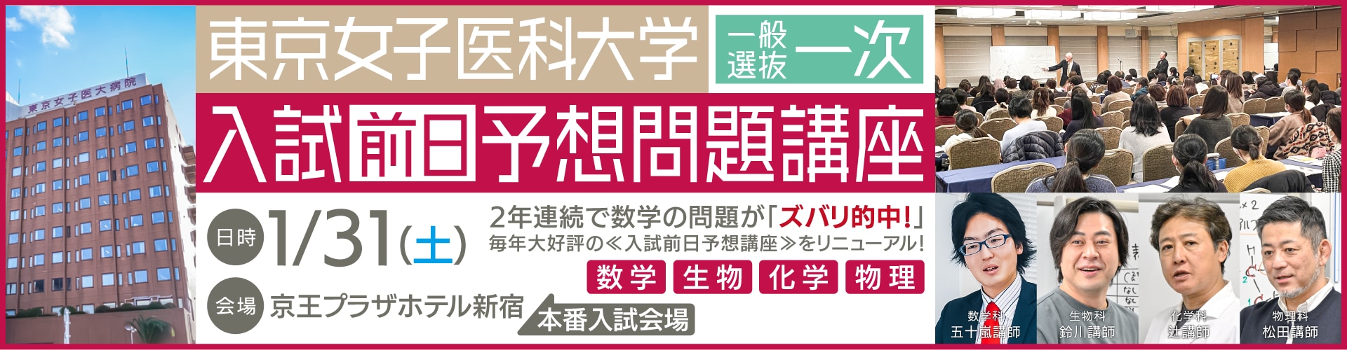 これは私立医学部入試に精通しているスーパー講師陣が、今年のねらい目となる予想問題や分野を一次試験の前日に集中講義するだけでなく、どうすれば本番の入試で点が取れるかを問題文から丁寧に読み解いていく講座です。