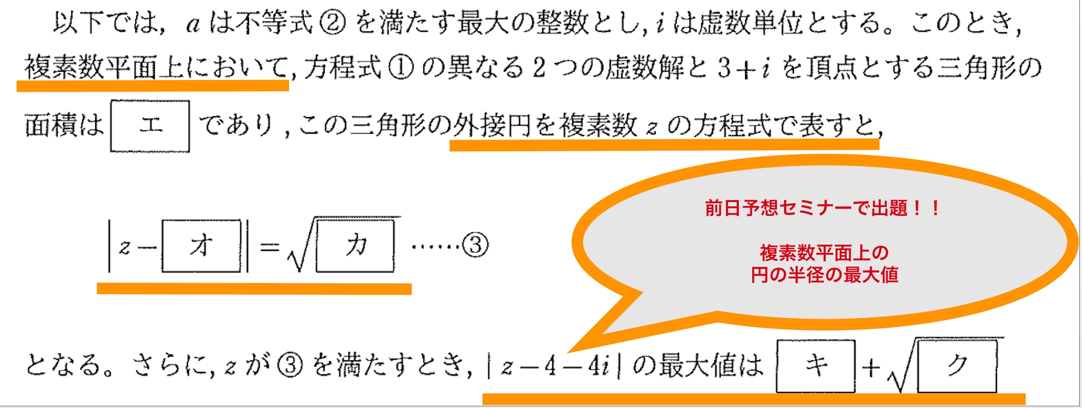 なるほどそういうものかと思っていたら、なんと入試本番でも複素数平面が出題されたというではありませんか!しかも図形とからめた「円の半径の最大値」が出たということで、入試前日予想セミナーに参加していた生徒たちは「そのまま出た!」「できたできた!」と大騒ぎで帰ってきました。