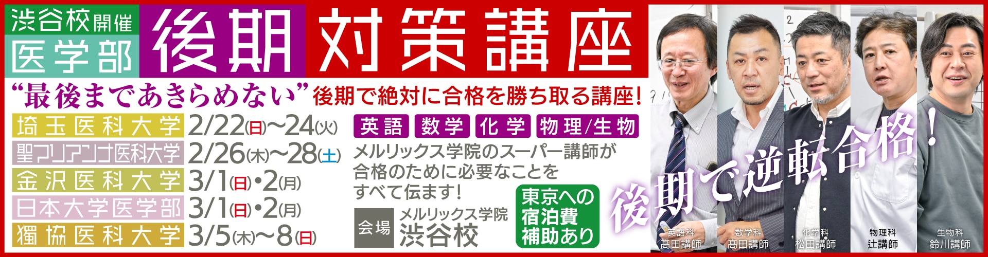 メルリックス学院渋谷校では、獨協医科大学後期入試で合格を目指す方に向けて、対策講座を実施いたします。