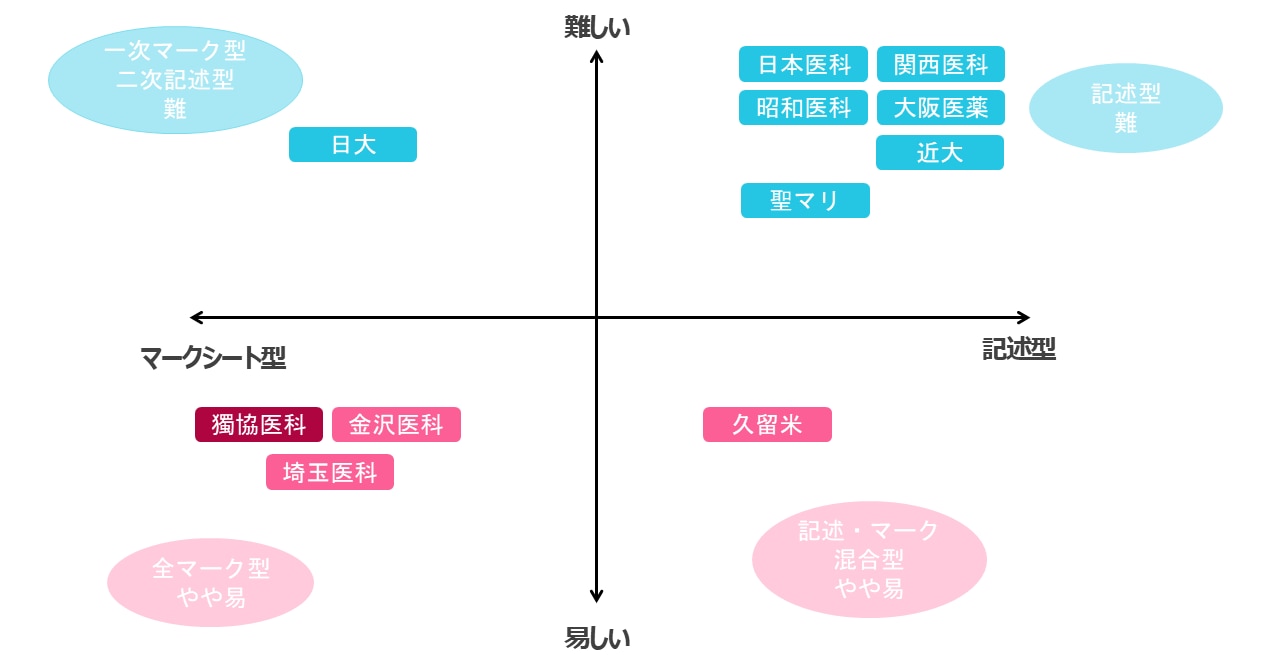 近い受験層が主になるのは、埼玉医科、金沢医科の後期入試になりますが、いずれもマークシートが主体になります。2026年度入試においては日程的にみてもかつ試験形式的にみても3校をセットにするのが最後に医学部に滑り込みたい受験生にとっては得策といえるでしょう。