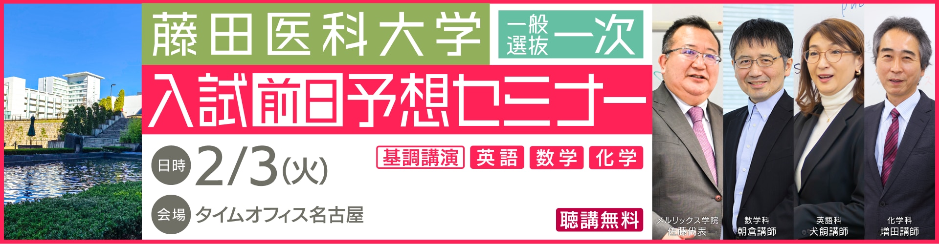 藤田医科大学医学部は、2026年度一般選抜においては、一次試験を2月4日(水)に実施します。これまで藤田医科大学の一次試験は、共通テスト翌週の木曜日に行われるのが通例でしたが、 2024年度入試から試験日が2月4日に変更され、現在はこの日程が定着しています。