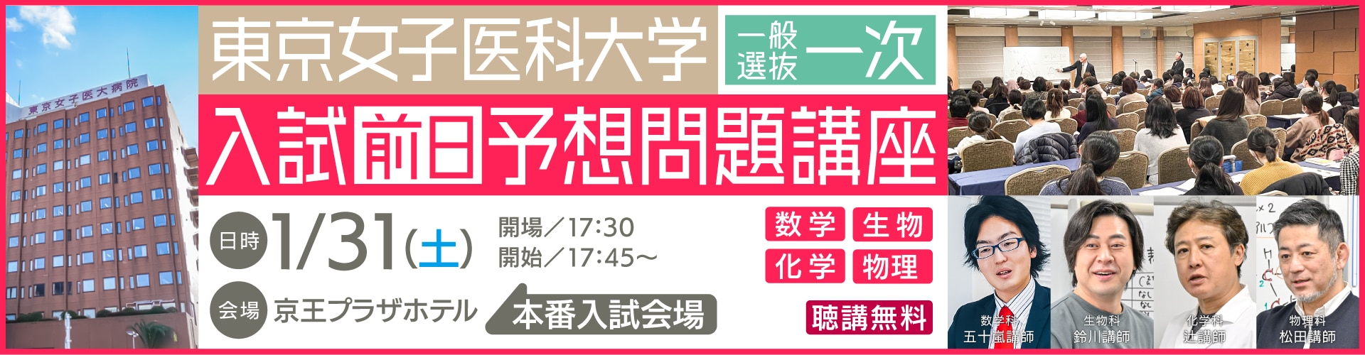 以上、東京女子医科大学の大まかな情報についてお伝えしました。より詳しい内容、分析については試験前日に一次試験の会場である京王プラザホテル新宿で行われる【前日予想問題講座】でお伝えしたいと思います。