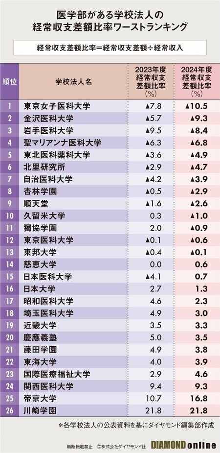 一方で ダイヤモンドオンラインが出している資料によると川崎医科大学は経常収支差額比率(経常収支差額比率=経常収支差額÷経常収入)が 私立医科大学32大学中、最も優良であると紹介されております。
