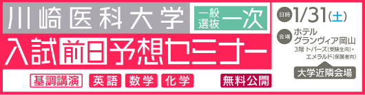 以上、川崎医科大学の大まかな情報についてお伝えしました。より詳しい内容、分析については試験前日1月31日15時30分よりホテルグランヴィア岡山にて行われる入試前日セミナーをぜひ活用していただきたいと思います。直前ガイダンスと数学、化学 英語のワンポイント予想講座になっています。