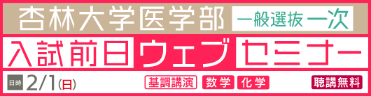 杏林大学医学部入試に関するより詳細な分析つきましては、試験前日の2月1日(日)にZoomウェビナーにてオンラインセミナーを行うことが決まりました。受験に向けての気持ちの最後の整理の場としてご活用いただければ幸いです。⇒お申込みはこちらからお願いします。