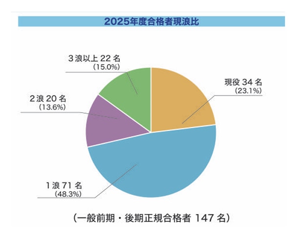 2025年度入試においては現役23.1% 1浪48.3% 2浪13.6% 3浪以上15.0%であります。
