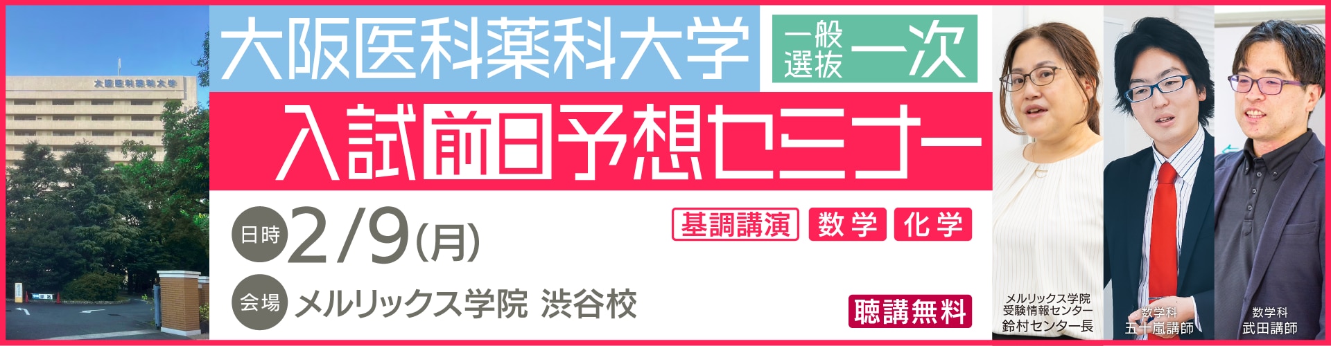 より詳しい内容、分析については試験前日2月9日にメルリックス学院渋谷校で行われる入試前日セミナーを活用していただきたいと思います。直前ガイダンスと数学と化学のワンポイント予想講座になっています。メルリックス学院人気講師による、ここでしか聞けない解説となっておりますので、ぜひお申込みください。
