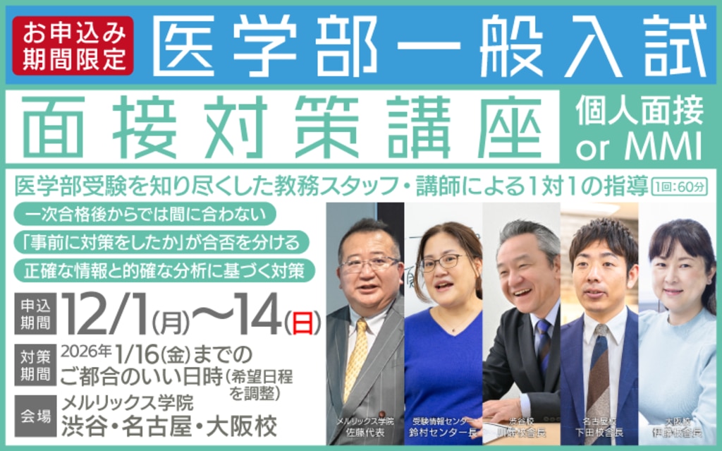 医学部の個人面接・MMIを対策したい方 特におすすめは二次試験で個人面接やMMI(慈恵、東邦、藤田など)を課す大学を受験する方 |