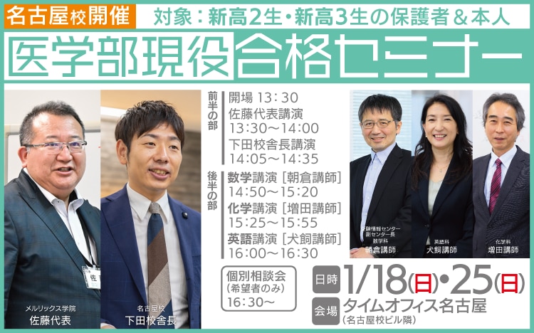 【前半の部】 13:00~ 開場 13:30~14:00 メルリックス学院代表 佐藤正憲 講演 「メルリックス生 藤田、愛知合格者 3年分河合塾模試成績の徹底解析」 14:05~14:35 メルリックス学院名古屋校校舎長 下田侑生 講演 「どこよりも早いふじた未来入試・愛知医科推薦入試 報告会」 【後半の部】 15:25~15:55 化学 講演 16:00~16:30 英語 講演 16:30~ 個別相談(希望者のみ) |