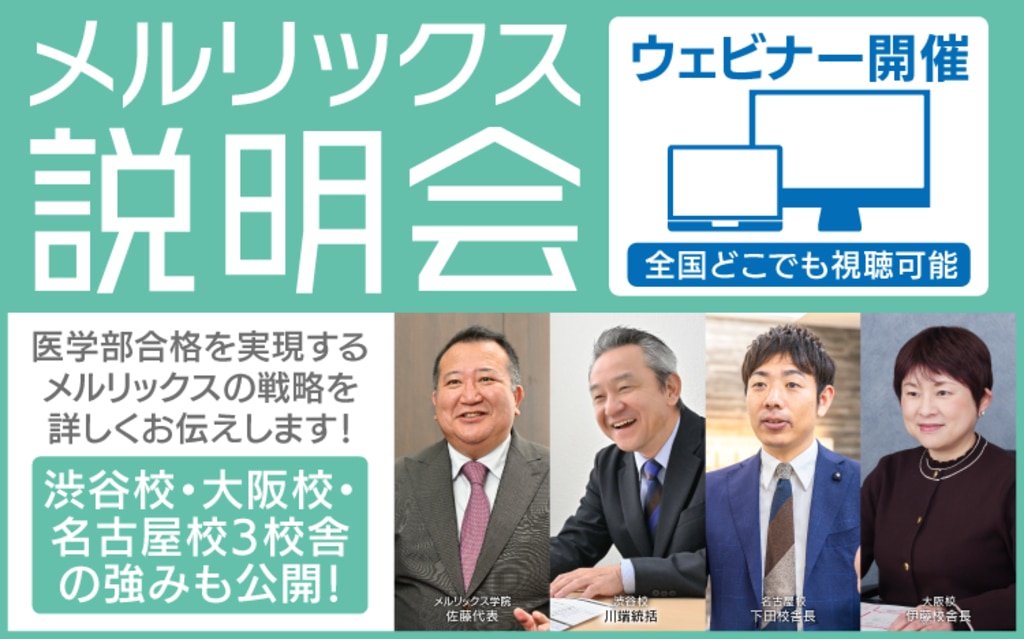 ・メルリックス学院の合格実績について ・メルリックス学院の講師や指導の特徴について ・偏差値が低くても医歯学部に合格する方法 ・受験生の生活のサポートについて……などなど |