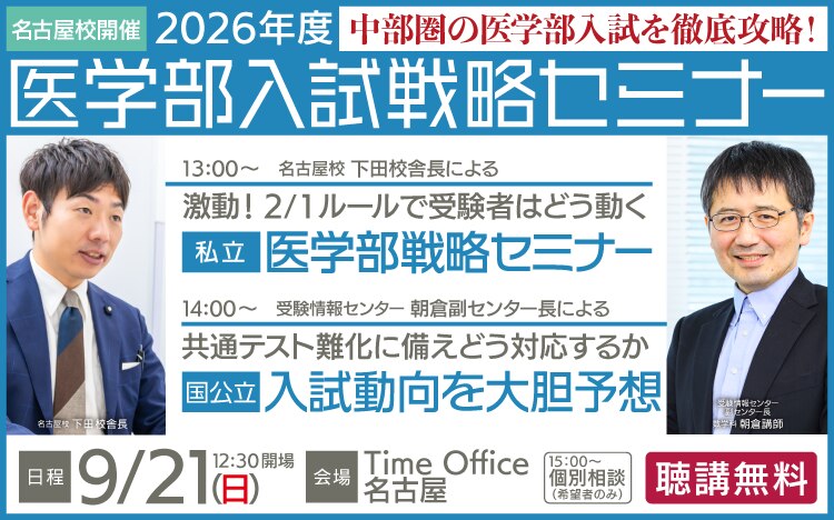 2026年度の医学部入試は、2/1ルールの導入や共通テスト難化の影響により、中部圏でも大きな変化が予想されています。本セミナーでは「私立医学部の最新戦略」と「中部圏国公立の入試動向」を専門家が徹底解説。