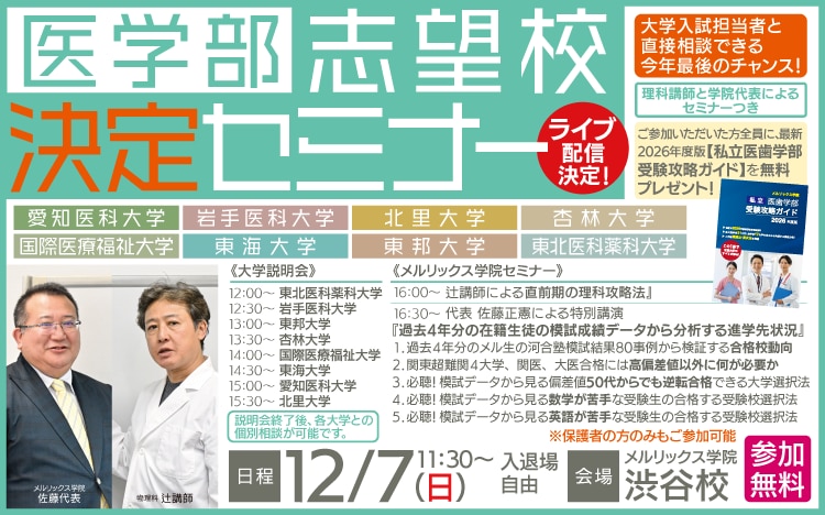メルリックス学院では渋谷校に医学部入試担当者をお招きして、志望校を決める最後の説明会&個別相談を行います。この最後のチャンスをぜひお見逃しなく!