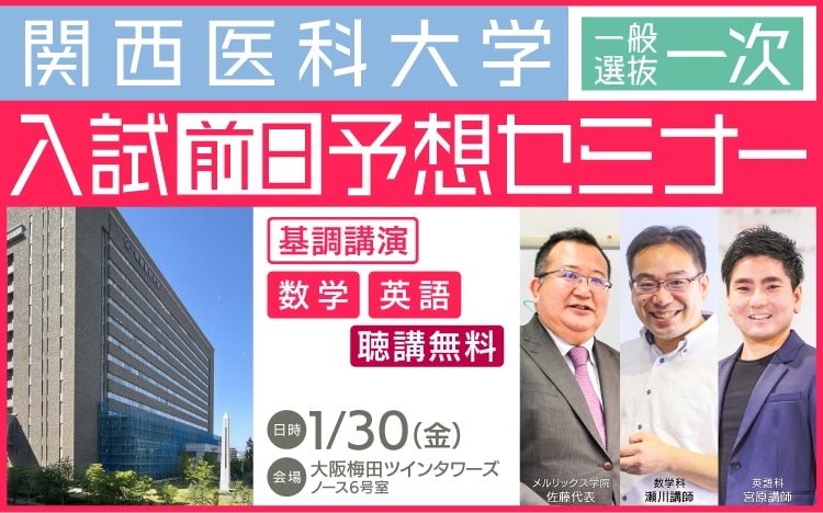 関西の医学部受験生に絶大な人気がある関西医科大学の一次試験前日に、直前ガイダンスとワンポイント予想講座を大阪梅田ツインタワーズ・ノースで開催します。