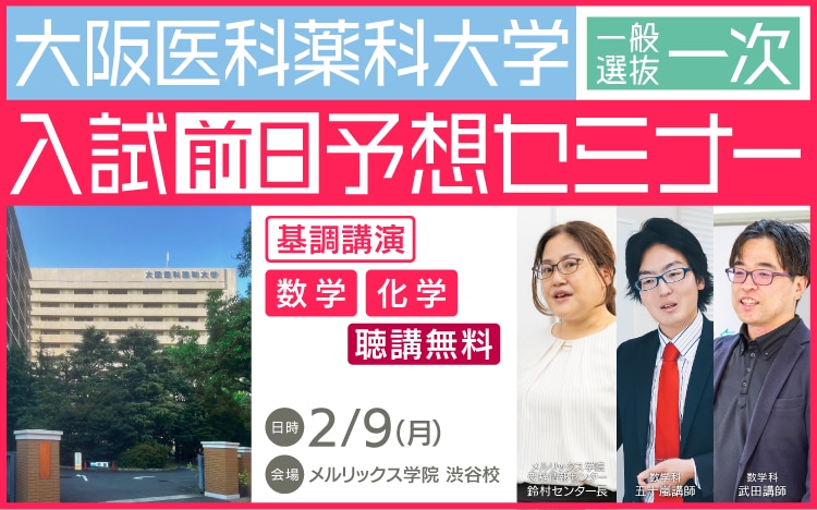 関西圏で根強い人気を誇る大阪医科薬科大学の前期一次試験前日に、直前ガイダンスとワンポイント予想講座をメルリックス渋谷校で開催します。